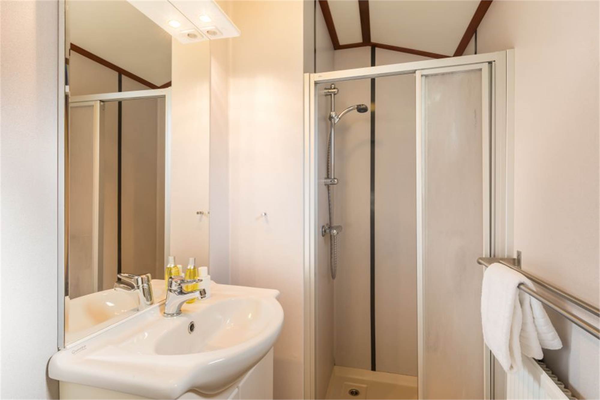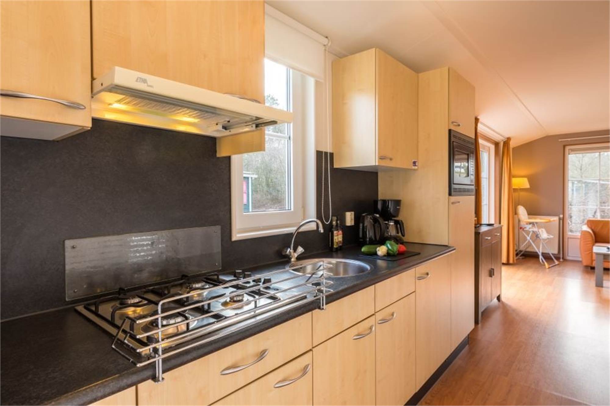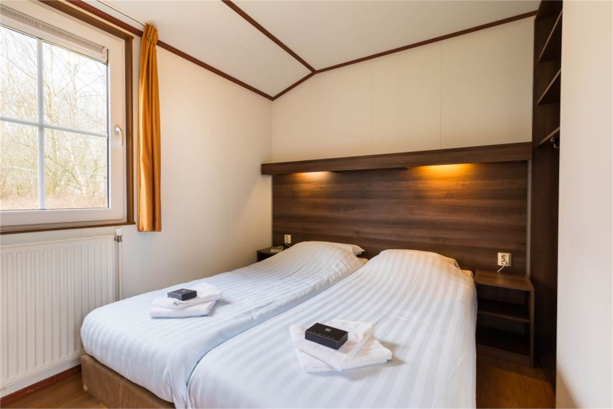 Dit kindvriendelijke, vrijstaande chalet is geschikt voor 4 volwassenen en 1 kind. De woonkamer is voorzien van een aparte eethoek en in de keuken vind je onder andere een combimagnetron en koffiezetapparaat. Daarnaast zijn er 2 slaapkamers met 2 eenpersoonsboxspringbedden en is er een badkamer met douche en een apart toilet. Ook is het chalet uitgerust met een kinderbed en -stoel en zijn de wandcontactdozen afgeschermd. Verder is er een gemeubileerd terras en kan je gratis gebruikmaken van wifi.