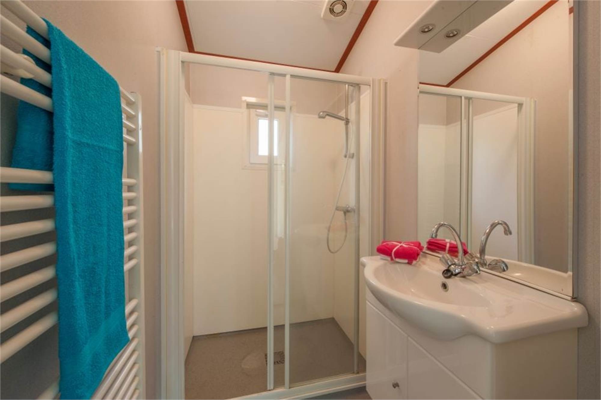 In dit ruime chalet voor 6 personen vind je een woonkamer met openslaande deuren en een open keuken met eethoek. Er zijn 3 slaapkamers, waarvan 1 met een stapelbed. In de badkamer vind je een douche en wastafel en er is een apart toilet. De woning beschikt over een terras met tuinmeubilair en er is een berging.