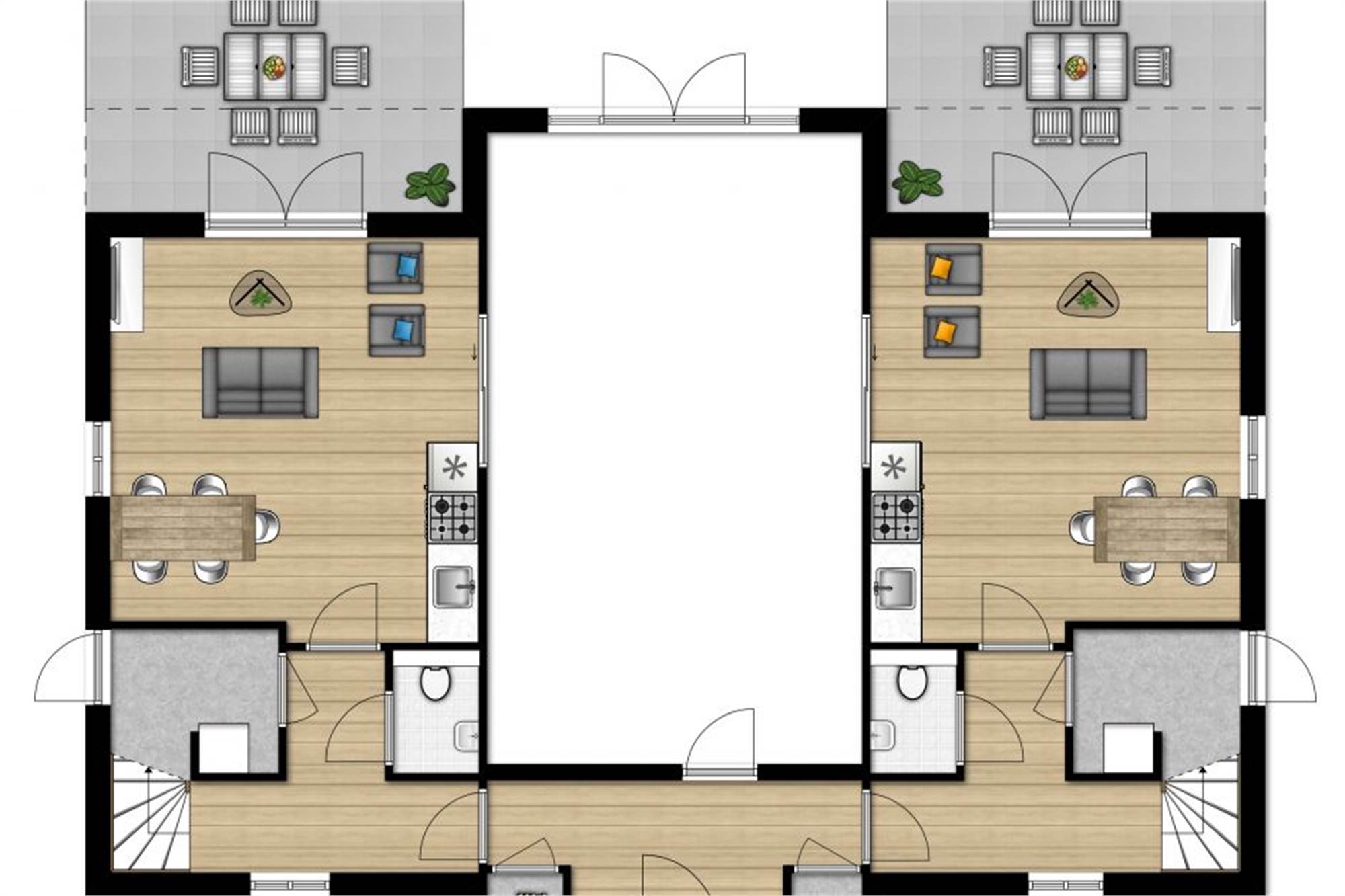 Deze luxe geschakelde bungalow op Résidence Klein Vink is geschikt voor 5 personen en is onderdeel van een 3-onder-1-kap. Type KVR5 is óf aan de linkerkant óf aan de rechterkant gesitueerd. Via een gezamenlijke, centrale entree kom je in je eigen hal, die toegang biedt tot de lichte woonkamer met openslaande deuren naar het terras. De keuken is voorzien van luxe inbouwapparatuur, waaronder een vaatwasser. Op de verdieping vind je 1 slaapkamer met 2 eenpersoonsbedden en 1 slaapkamer met 3 eenpersoonsbedden. Er is een badkamer met douche en toilet. Op de begane grond is er een apart toilet. je kunt gratis gebruikmaken van wifi.