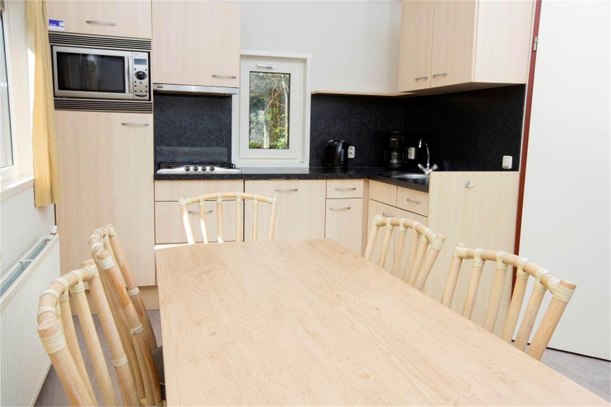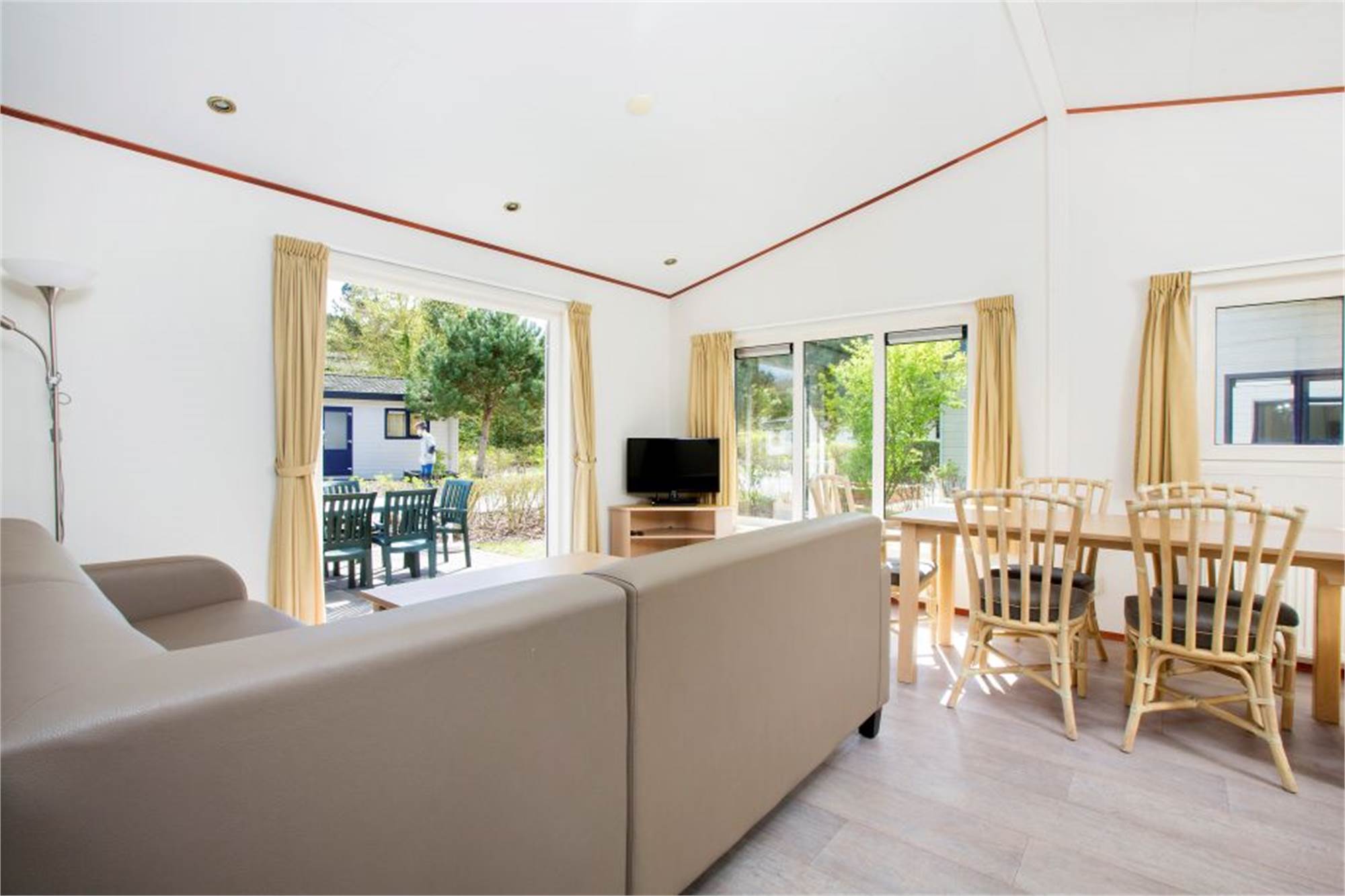 Dit chalet is vrijstaand en geschikt voor 6 personen. Er is een woonkamer met eethoek en een open keuken met vaatwasser en combimagnetron. Er zijn 3 slaapkamers, waarvan 1 met een stapelbed en de badkamer is voorzien van een douche en wastafel. Ook is er een apart toilet. Via de openslaande deuren loop je zo vanuit de woonkamer het gemeubileerde terras op. Ook maak je gratis gebruik van wifi.