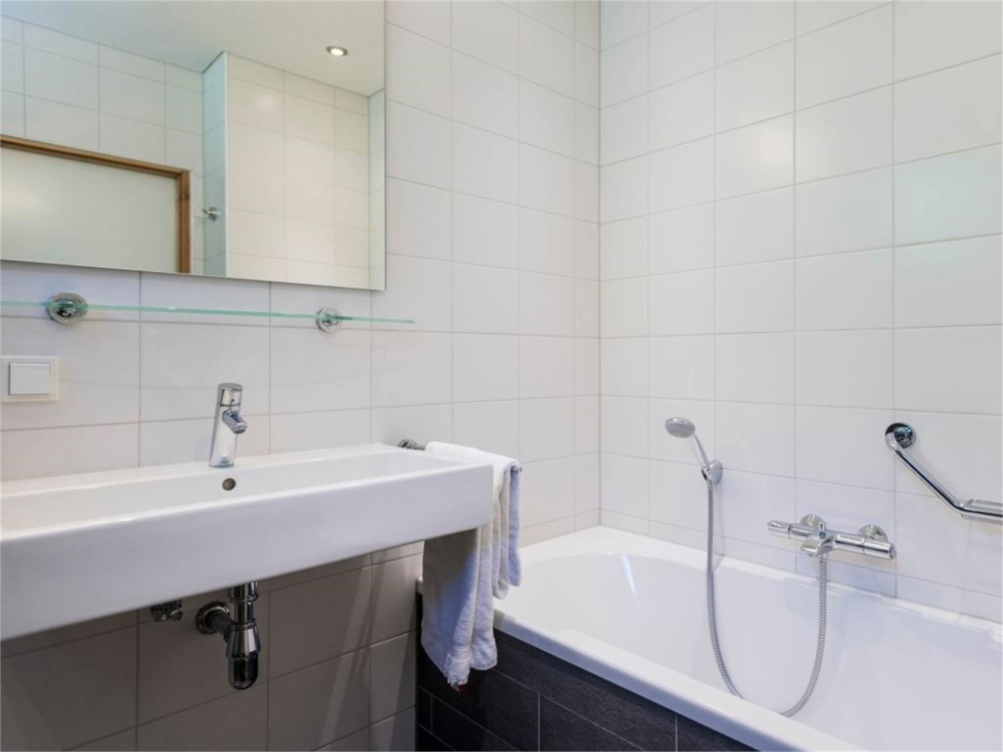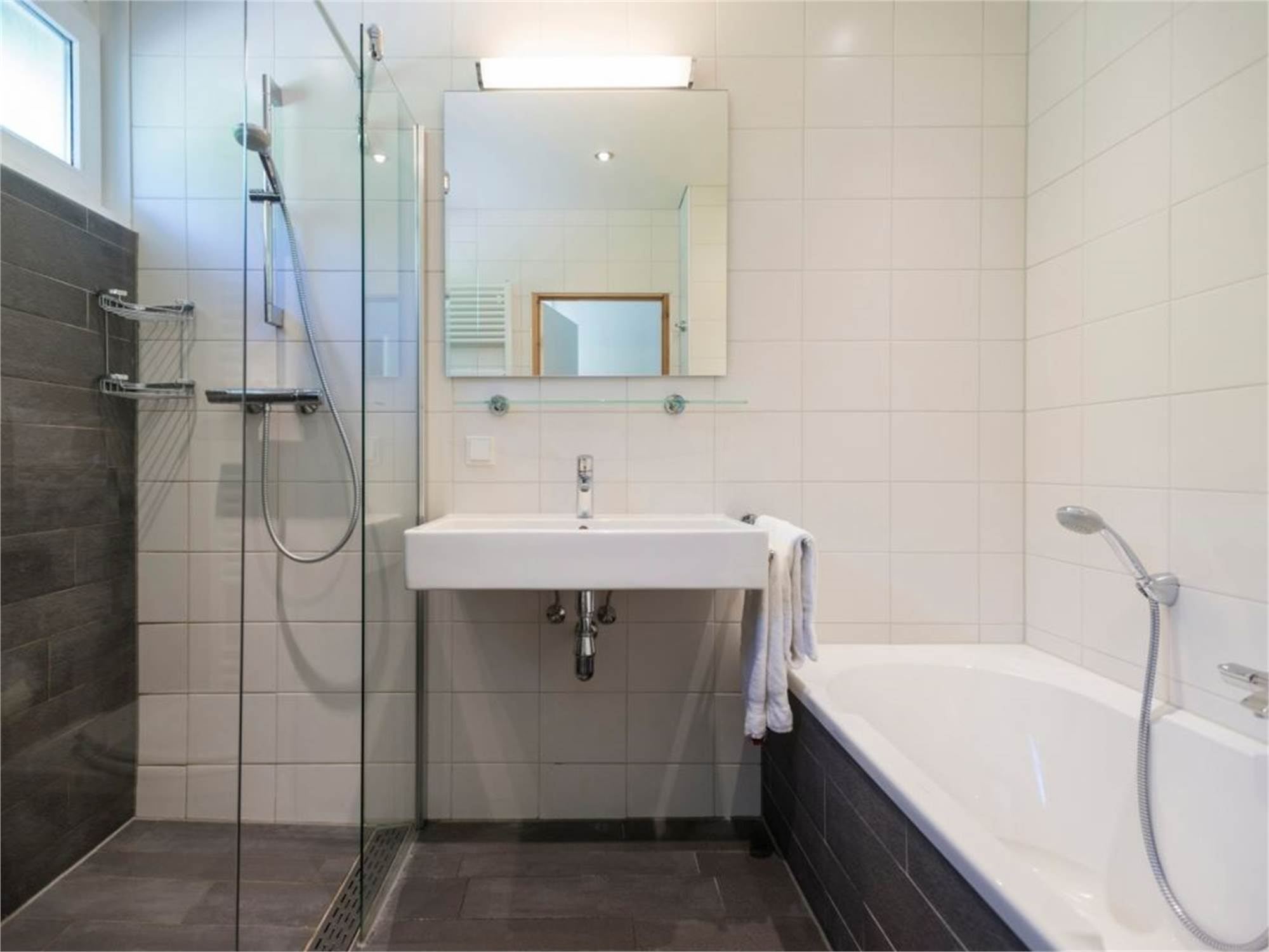 Salle de bains avec baignoire, cabine de douche, double lavabo et toilette