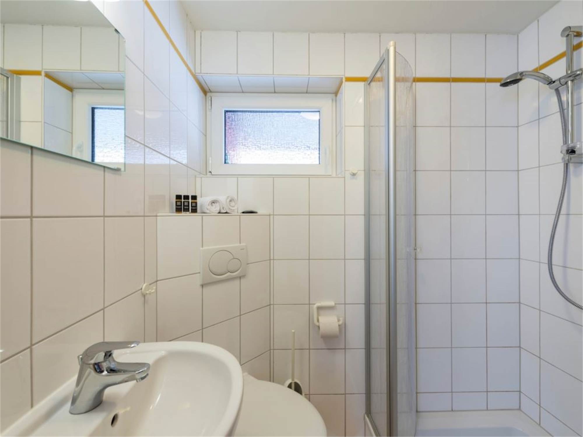 • Salle de bains avec cabine de douche, lavabo et toilette