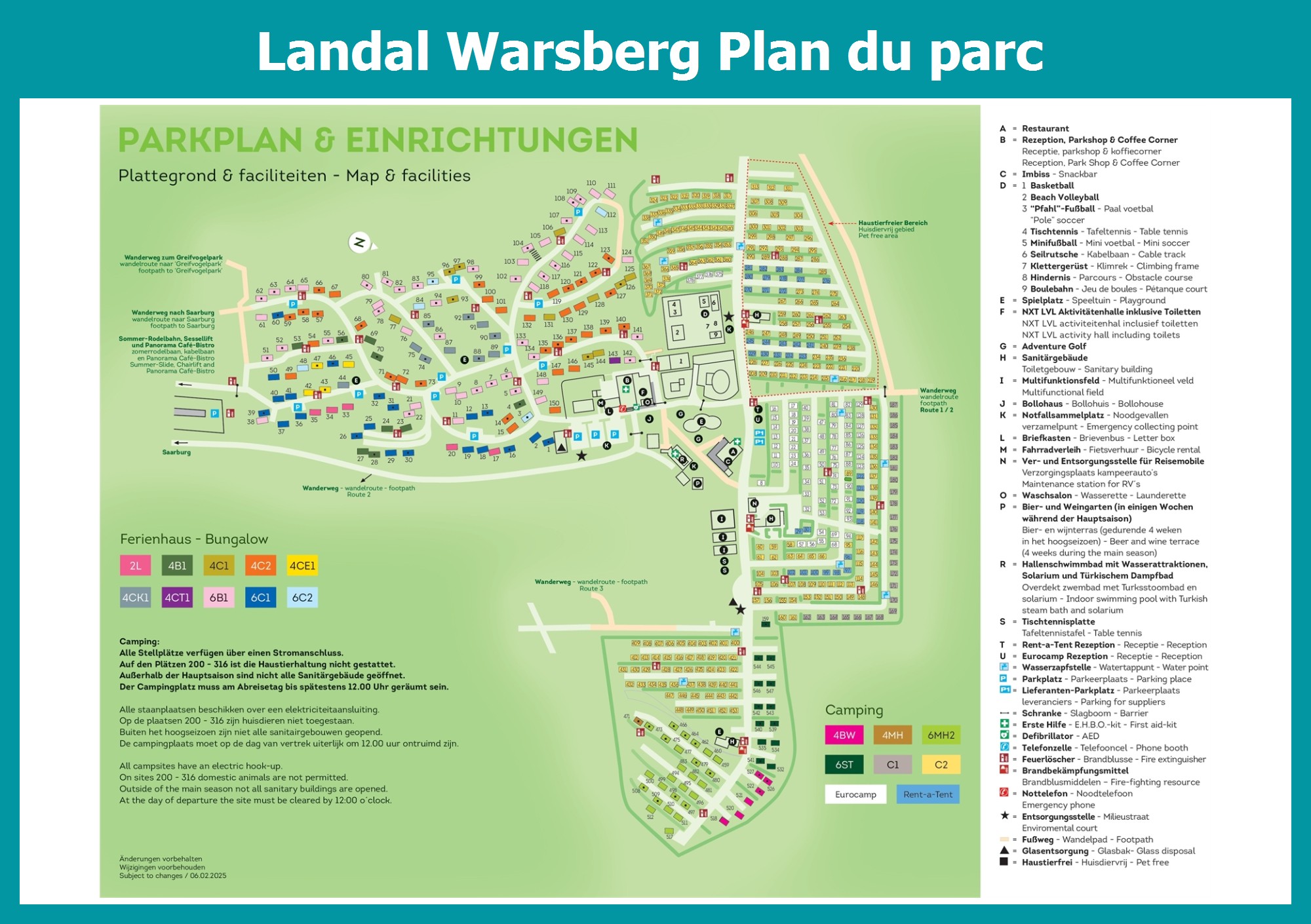 Le plan actuel du Landal Warsberg avec tous les hébergements et installations, est aussi disponible en pdf.