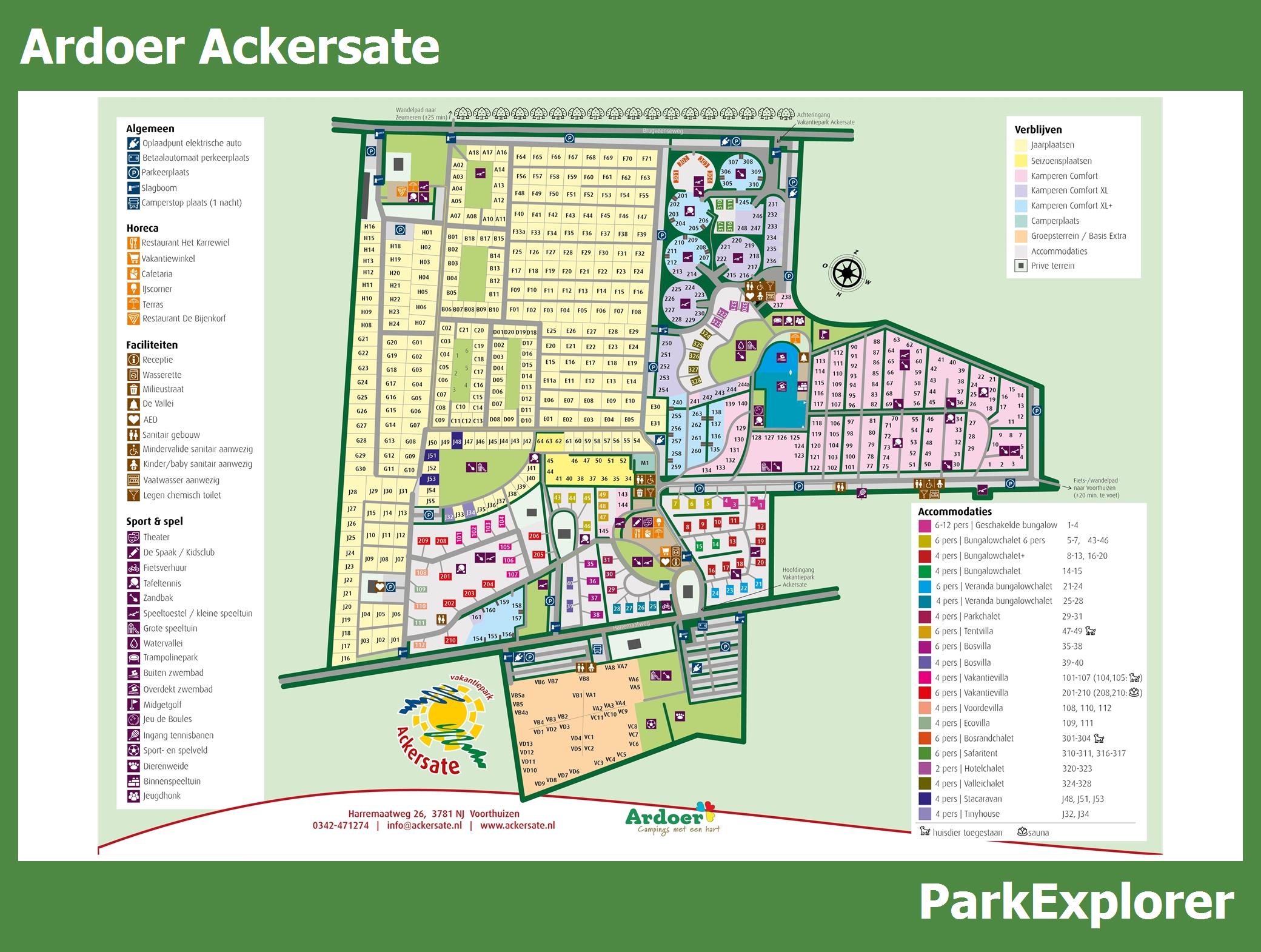 De park plattegrond van Ackersate is niet alleen zeer handig tijdens het verblijf, maar vooral ook tijdens het boeken. De plattegrond geeft een goed beeld van de aanwezige faciliteiten en de ligging ervan op het park. TIP: Boek met voorkeursligging en kies een huisje in de buurt van de belangrijkste faciliteiten.