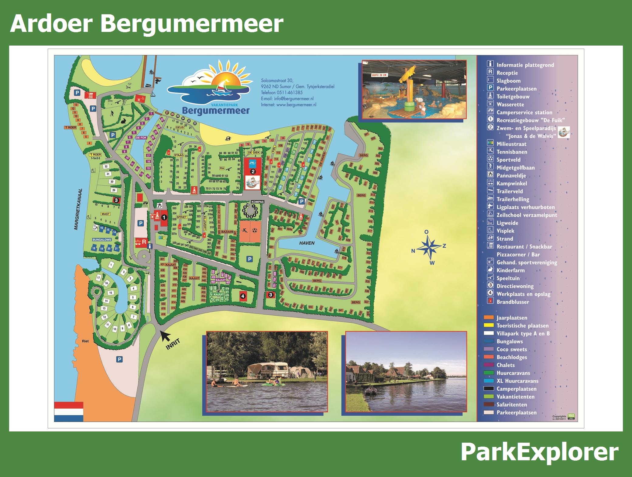 Actuele en overzichtelijke park plattegrond van Bergumermeer met alle huisjes en faciliteiten, ook te downloaden als PDF.
