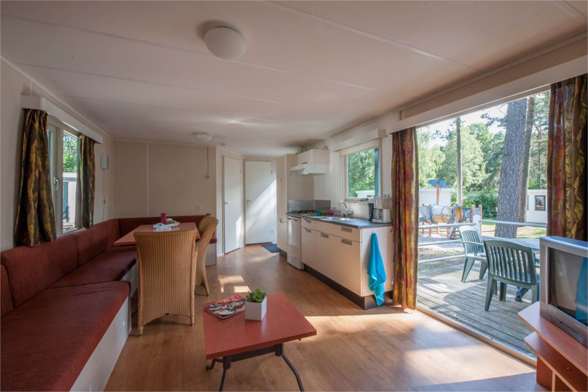 Deze vrijstaande chalet is geschikt voor 5 personen en 1 baby. Er is een woonkamer met eethoek en een open keuken. Er zijn 3 slaapkamers en in de badkamer vind je een douche, wastafel en toilet. Elk chalet beschikt over een kinderbedje, kinderstoel en terras met tuinmeubilair en is voorzien van tuinomheining.