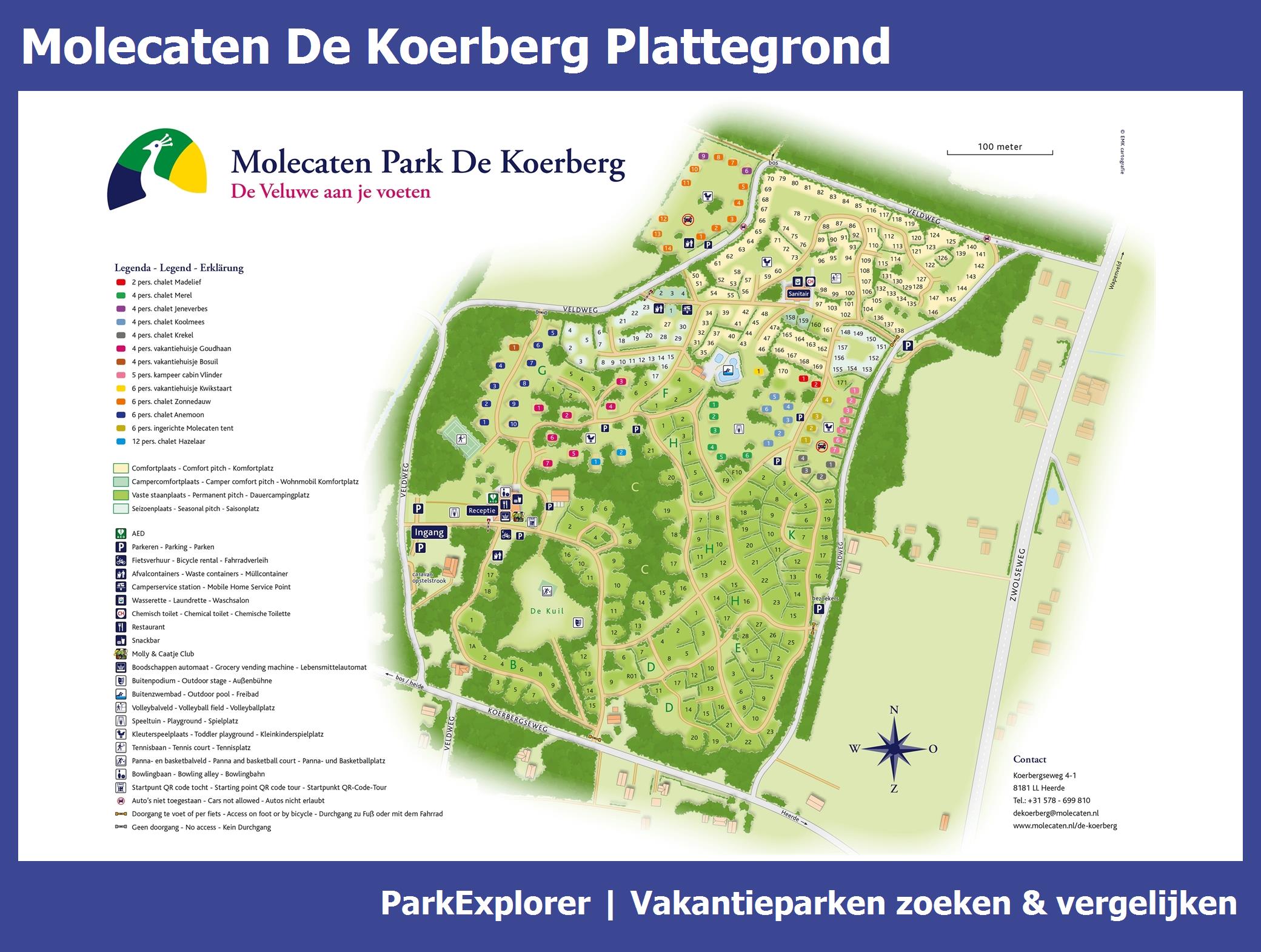 De park plattegrond van Molecaten De Koerberg is niet alleen zeer handig tijdens het verblijf, maar vooral ook tijdens het boeken. De plattegrond geeft een goed beeld van de aanwezige faciliteiten en de ligging ervan op het park. TIP: Boek met voorkeursligging en kies een huisje in de buurt van de belangrijkste faciliteiten.