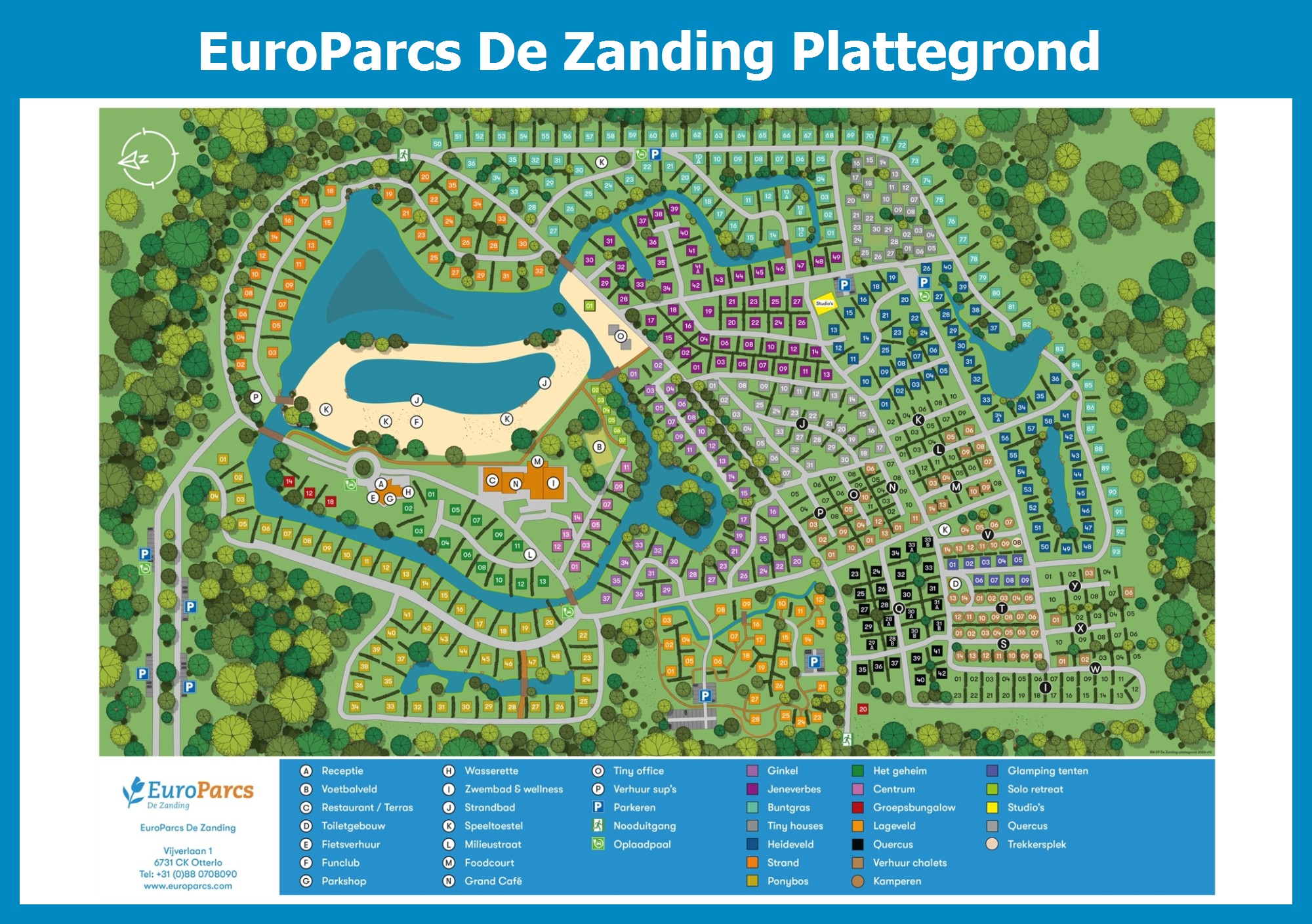De park plattegrond van EuroParcs De Zanding is niet alleen zeer handig tijdens het verblijf, maar vooral ook tijdens het boeken. De plattegrond geeft een goed beeld van de aanwezige faciliteiten en de ligging ervan op het park. TIP: Boek met voorkeursligging en kies een huisje in de buurt van de belangrijkste faciliteiten.