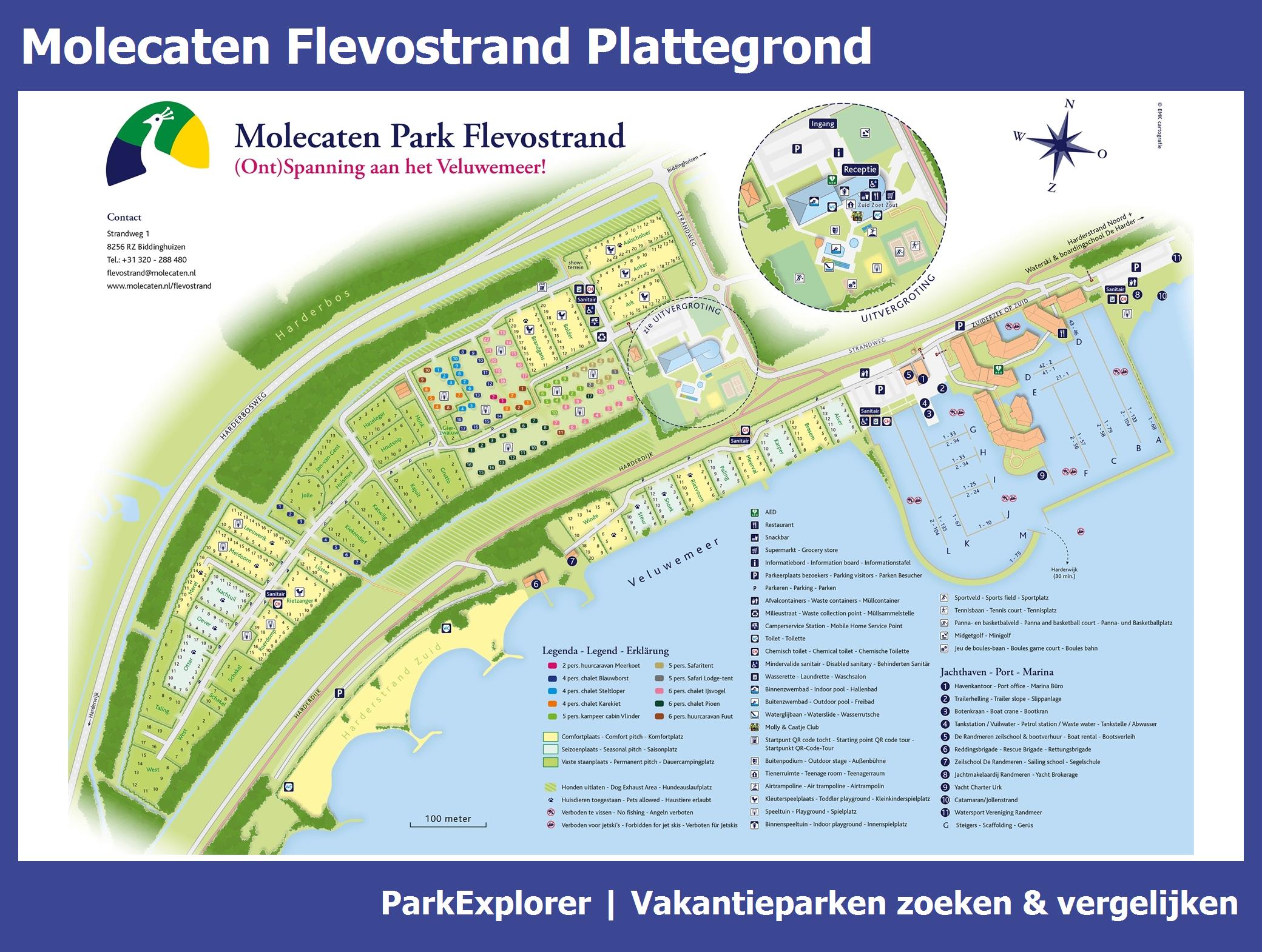De park plattegrond van Molecaten Flevostrand is niet alleen zeer handig tijdens het verblijf, maar vooral ook tijdens het boeken. De plattegrond geeft een goed beeld van de aanwezige faciliteiten en de ligging ervan op het park. TIP: Boek met voorkeursligging en kies een huisje in de buurt van de belangrijkste faciliteiten.