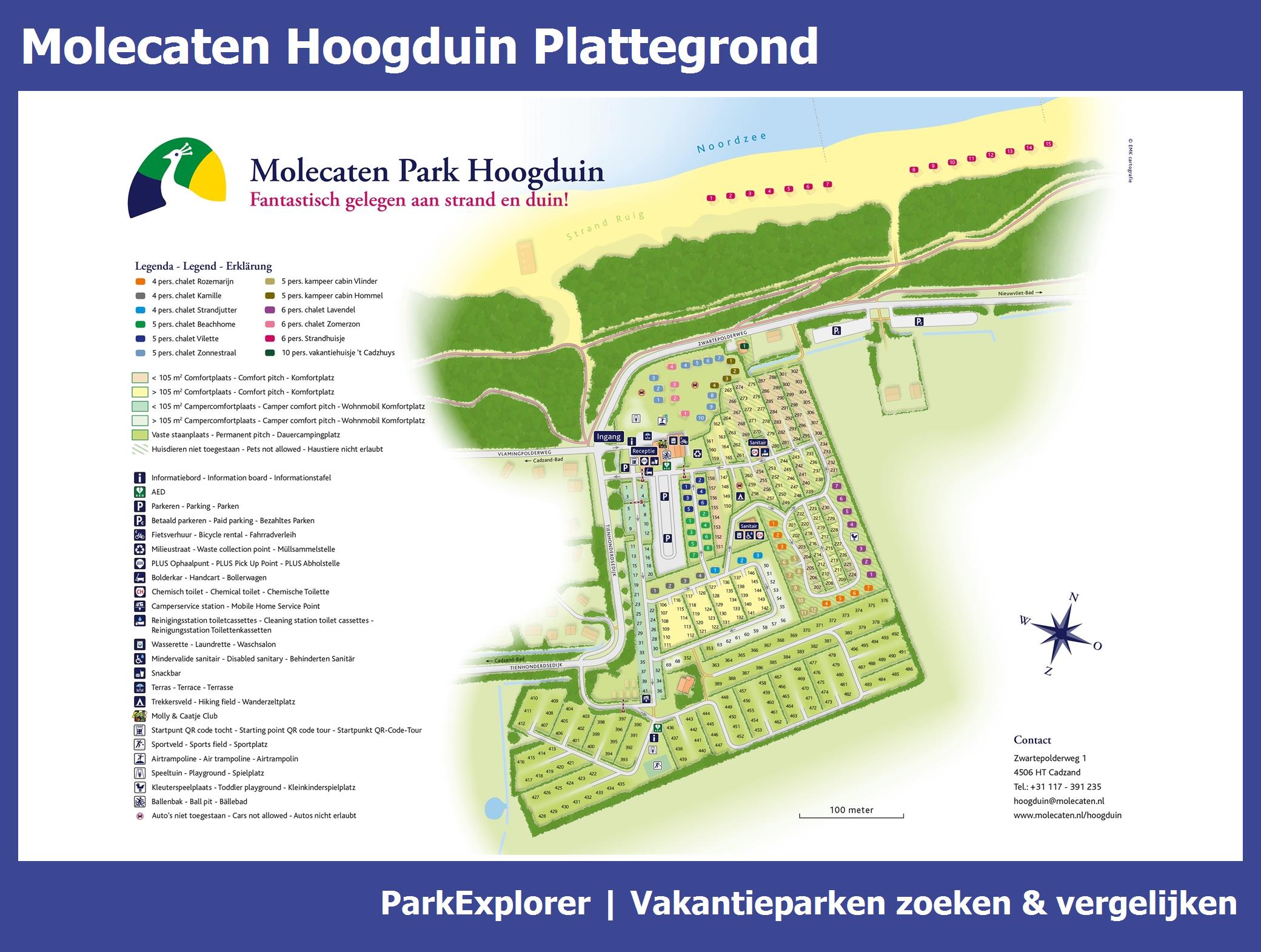 Actuele en overzichtelijke park plattegrond van Molecaten Hoogduin met alle huisjes en faciliteiten, ook te downloaden als PDF.