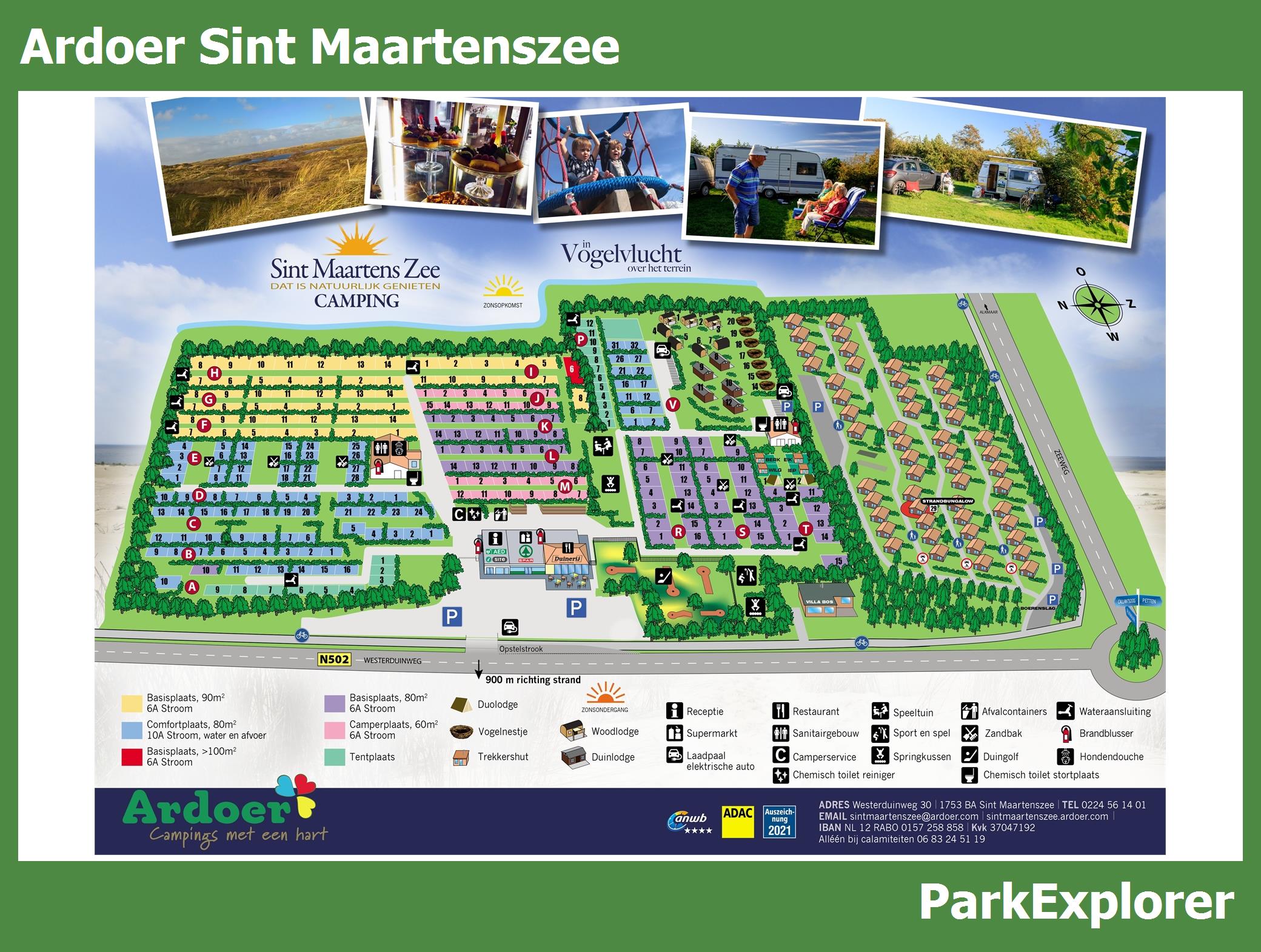 Actuele en overzichtelijke park plattegrond van Ardoer Sint Maartenszee met alle huisjes en faciliteiten, ook te downloaden als PDF.