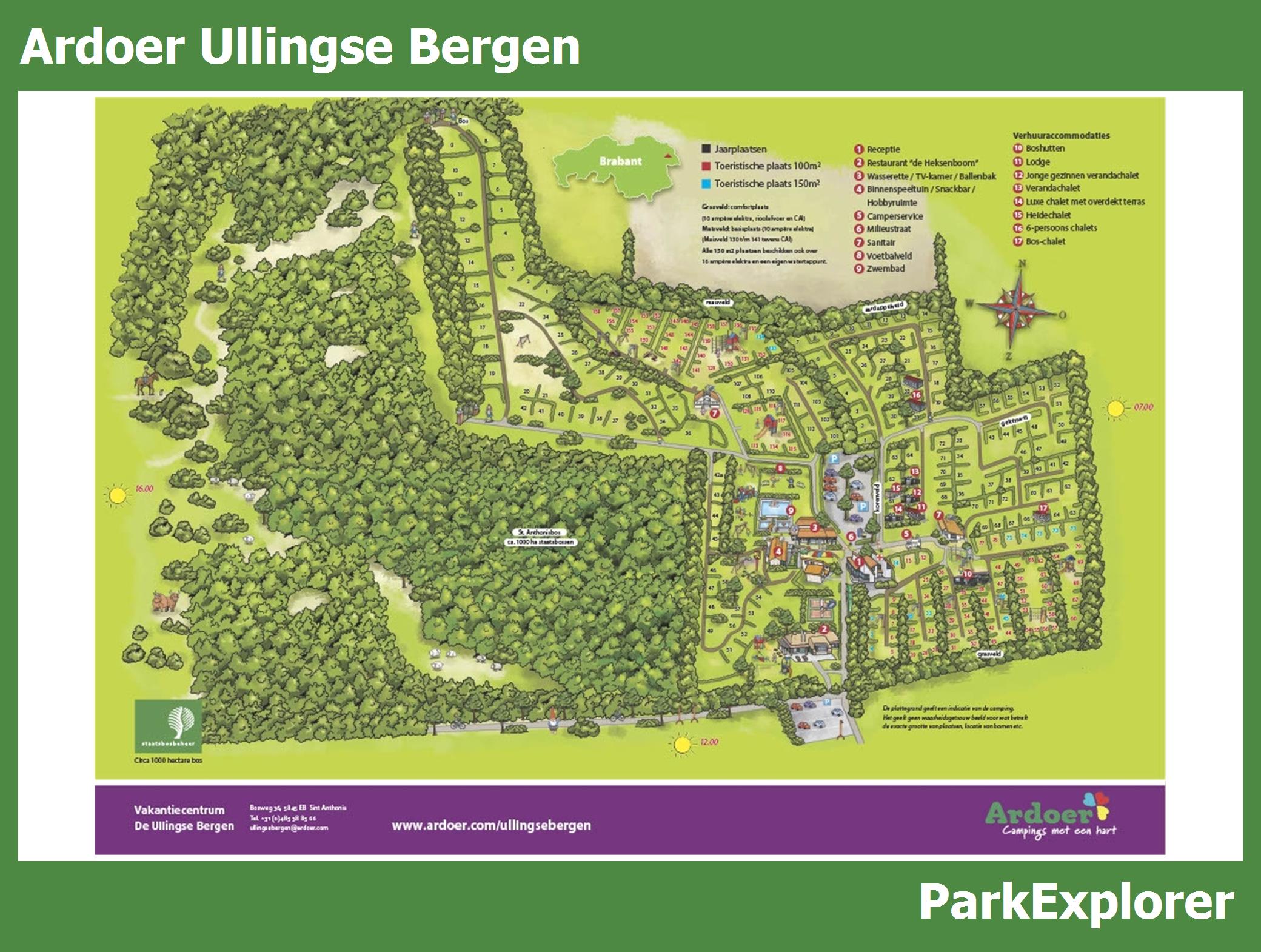 De park plattegrond van Ardoer Ullingse Bergen is niet alleen zeer handig tijdens het verblijf, maar vooral ook tijdens het boeken. De plattegrond geeft een goed beeld van de aanwezige faciliteiten en de ligging ervan op het park. TIP: Boek met voorkeursligging en kies een huisje in de buurt van de belangrijkste faciliteiten.