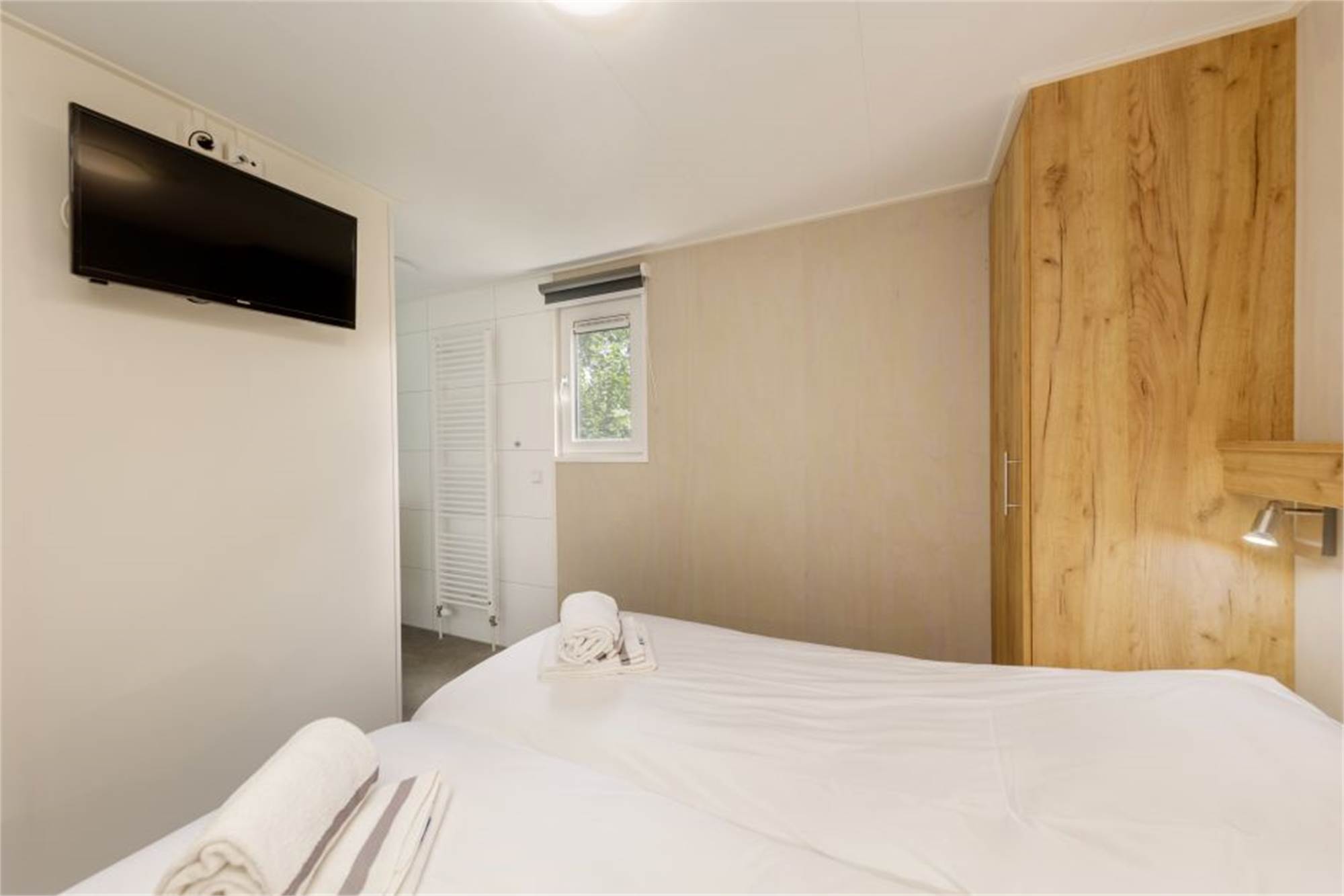 Dit nieuwe chalet is gelijkvloers en geschikt voor 4 personen. De woonkamer is voorzien van een smart-tv en de keuken beschikt onder andere over een combimagnetron, vaatwasser en koffiepadapparaat. Er zijn 2 slaapkamers aanwezig, beide kamers zijn voorzien van 2 eenpersoonsbedden. In dit chalet zijn 2 badkamers met inloopdouche, het toilet is apart. Buiten vind je een terras met tuinmeubilair.