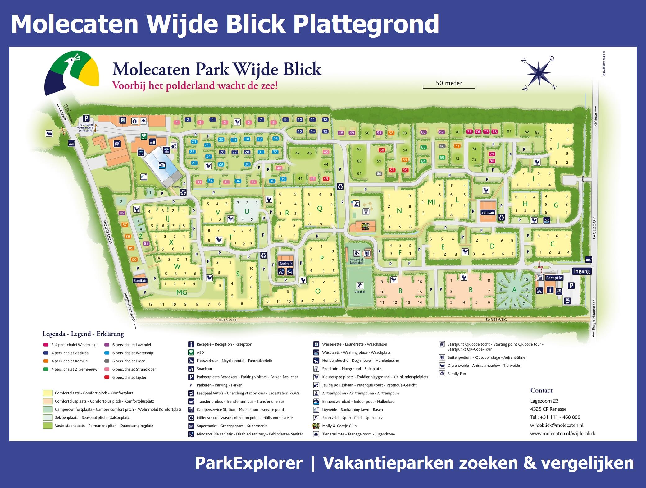 De park plattegrond van Molecaten Wijde Blick is niet alleen zeer handig tijdens het verblijf, maar vooral ook tijdens het boeken. De plattegrond geeft een goed beeld van de aanwezige faciliteiten en de ligging ervan op het park. TIP: Boek met voorkeursligging en kies een huisje in de buurt van de belangrijkste faciliteiten.