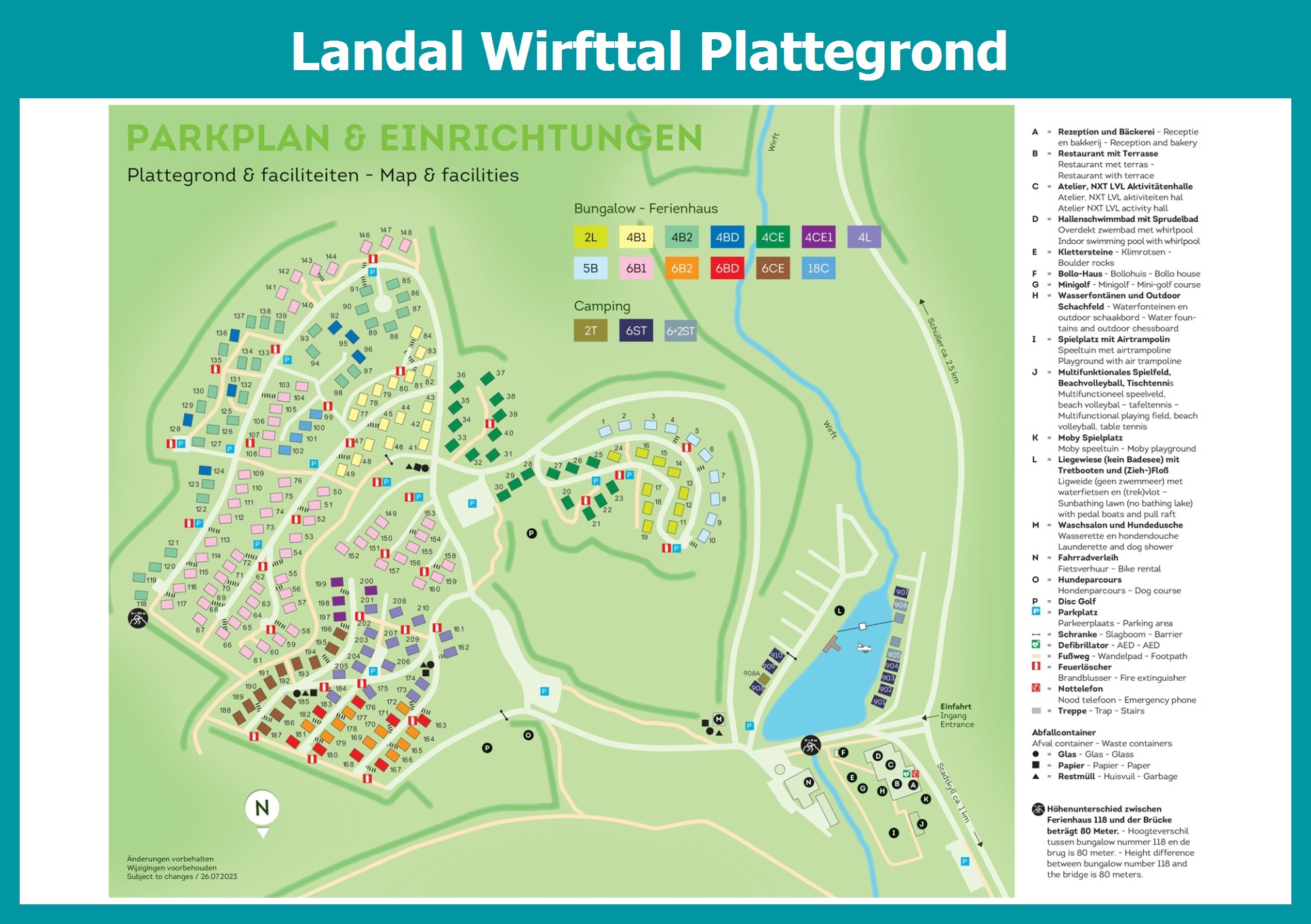 Actuele en overzichtelijke park plattegrond van Landal Wirfttal met alle huisjes en faciliteiten, ook te downloaden als PDF.